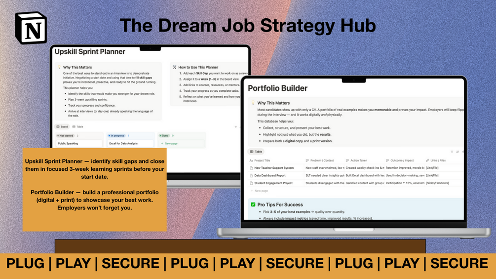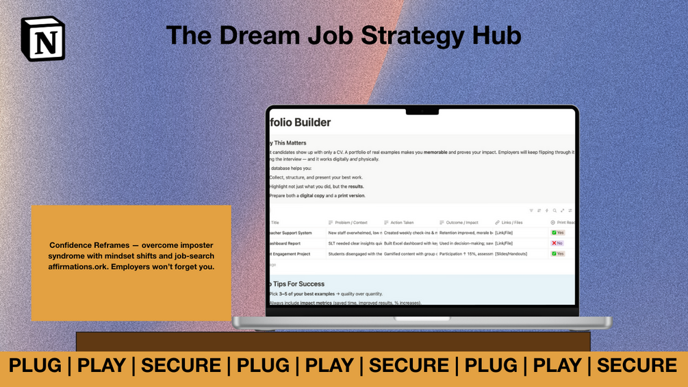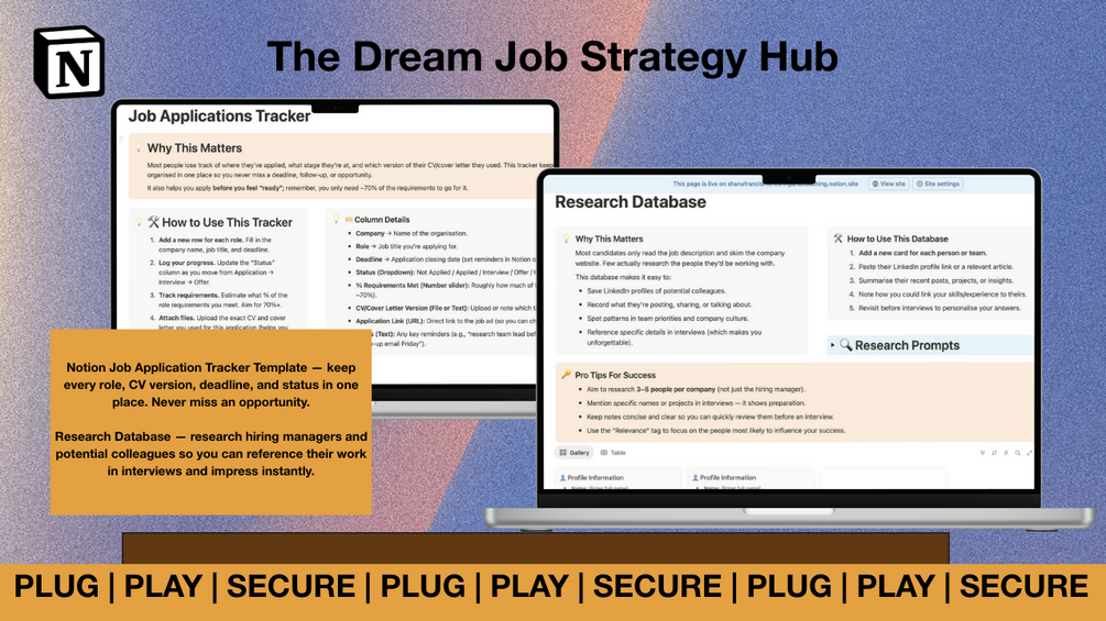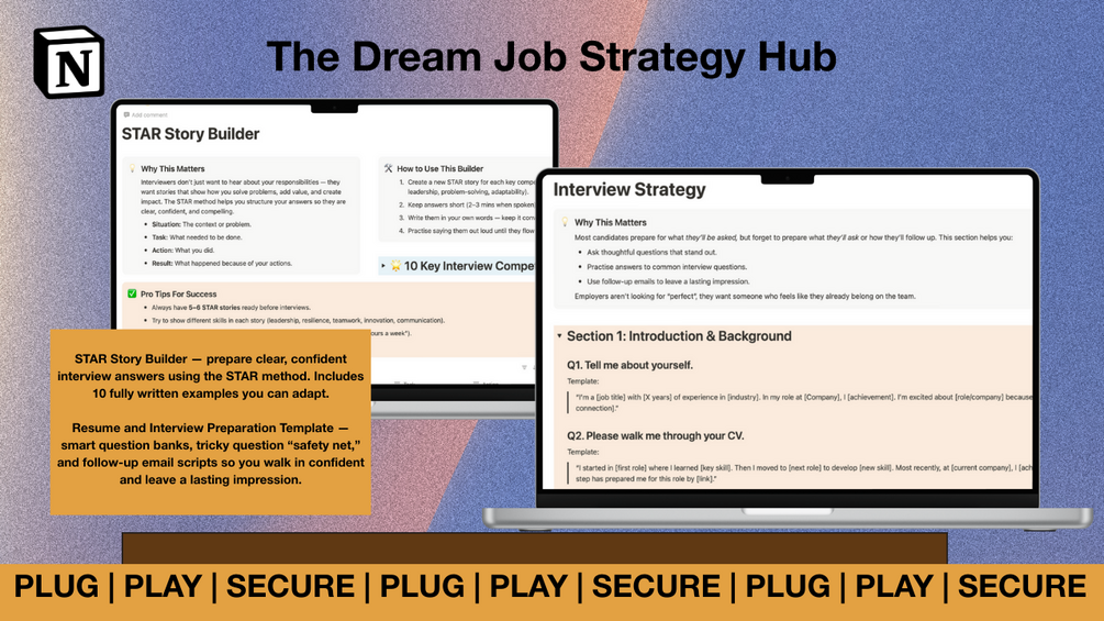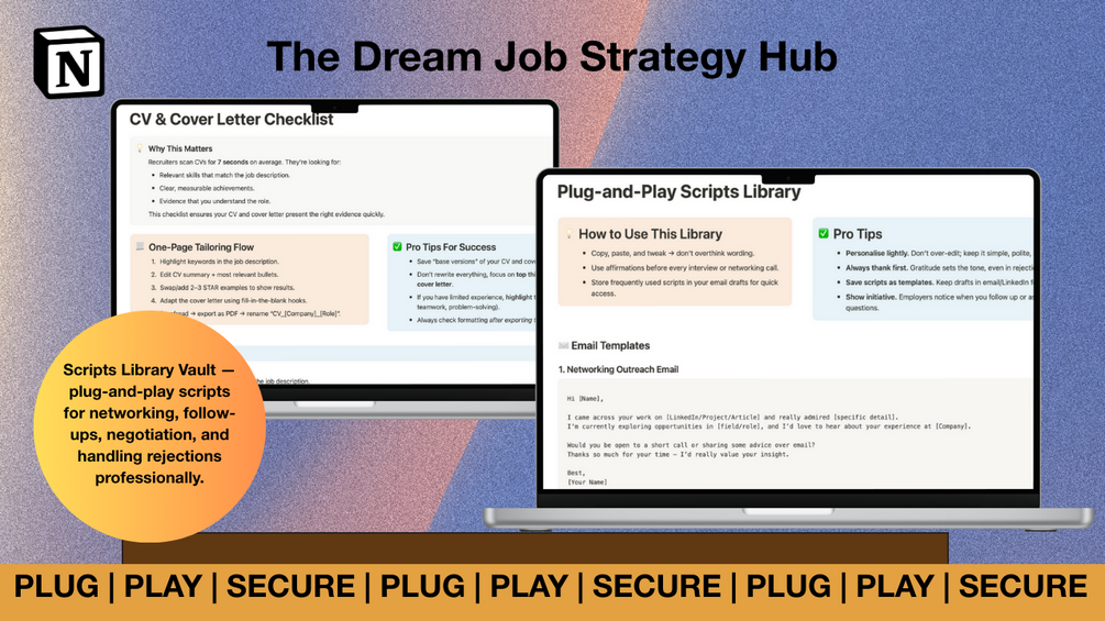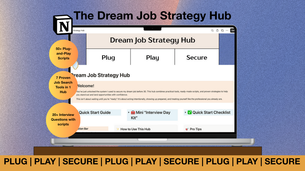 The Dream Job Strategy Hub is an all-in-one Notion career hub template designed for ambitious young professionals seeking their first or new role. It’s more than a tracker; it’s a career success system with proven strategies, ready-to-use scripts, and mindset tools to help you stand out and land your dream job.